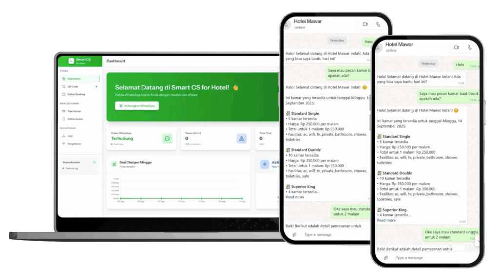 - SmartCS, solusi customer service otomatis berbasis AI, 24/7 untuk hotel, sekolah, e-commerce dll.
